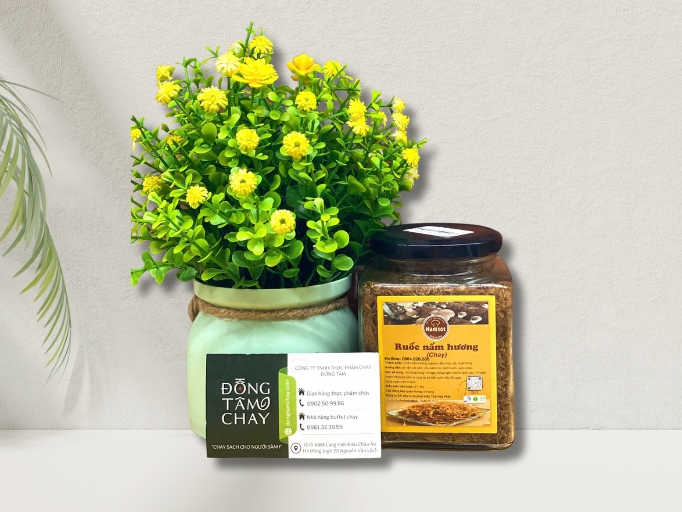 Ruốc nấm hương chay được làm từ nấm hương tươi, có hương vị đậm đà, thích hợp làm món ăn chay thay thế thịt. Có thể dùng kèm với cơm, bánh mì hoặc ăn trực tiếp.